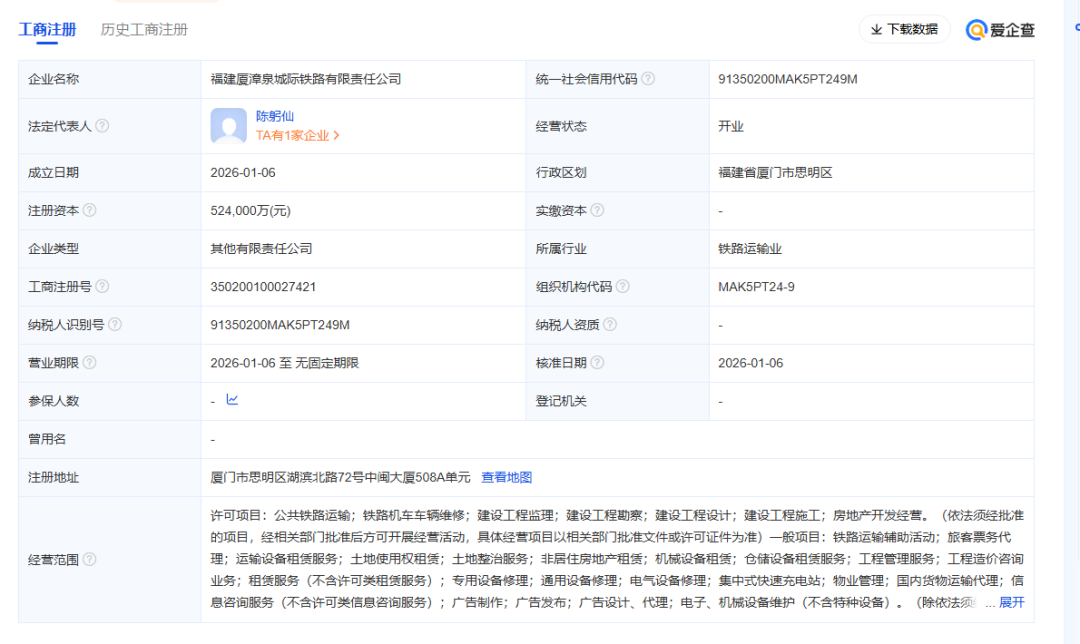 福建厦漳泉城际铁路有限责任公司于今日正式成立。公司注册资本52.4亿元,由福建省投资开发集团联合泉州、厦门、漳州三市共同组建。其中,泉州城 际铁路投资有限责任公司持股比例35.5878%,厦门城际铁路投资有限公司持股比例30.666%,漳州市交发城际铁路投资有限公司持股比例23.7462%,福建 省铁路投资有限责任公司持股比例10%。 | 工商注册 历史工商注册 | | | V 下车交易 | | --- | --- | --- | --- | | 企业名称 | 福建厦漳泉城际铁路有限责任公司 | 统一社会信用代码 7 | 91350200MAK5PT249M | | 法定代表人 ② | 院紧抓 TA有1家企业 > | 经营状态 | 开业 | | 成立日期 | 2026-01-06 | 行政区划 | 福建省厦门市思明区 | | 注册资本(?) | 524,000万(元) | 实缴资本(?) | | | 企业类型 | 其他有限责任公司 | 所属行业 | 铁路运输业 | | 工商注册号 (2) | 350200100027421 | 组织机构代码 3 | MAK5PT24-9 | | 纳税人识别号(2) | 913 ...