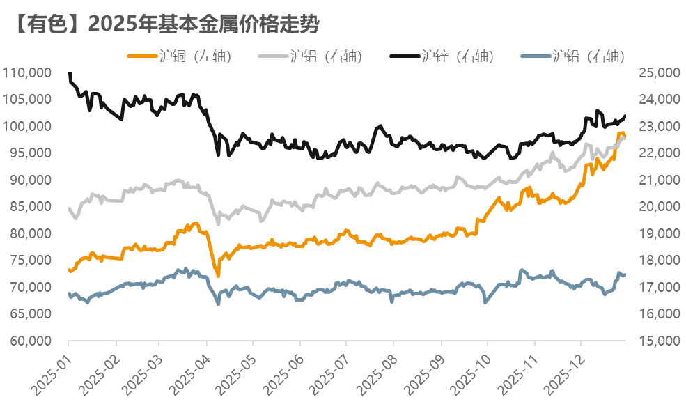 数据来源:Wind,紫金天风期货研究所 2025 年,全球秩序重构加剧,叠加特朗普政府上任,从年初的关税战爆发、政府效率部(DOGE)的横空出世、大美丽法案落地、威 胁解雇美联储主席鲍威尔、美国政府长期停摆等一系列事件的发生无一不牵动着市场的节奏。至2025年收官,伦敦现货黄金涨势超 60%、现货白银涨超140%,创1980年以来最佳表现。 数据来源:Wind,紫金天风期货研究所 铜 (来源:紫金天风期货研究所) 来源:紫金天风期货研究所 【20251231】【专题】回望2025:有色/贵金属最值得关注的N个时刻 引言 铜市场回顾 2025 年是全球宏观格局博弈与产业生态重塑交织的关键一年:贸易保护主义升级引发全球贸易体系扰动,AI 产业投资浪潮席卷全球; 新兴市场与 "全球南方" 活力凸显,我国 "十四五" 规划完美收官,"十五五" 开局在即,政策协同发力下的稳增长主线清晰。 市场层面,2025 年有色金属板块呈现 "先抑后扬" 的极致演绎:4 月美国关税政策落地引发板块集体恐慌性下探,多数品种触及年内低 点;而在 "供给刚性约束" 与 "新旧动能转换" 双重核心逻辑驱动下,铜、铝等核心品种成为资金配置核心 ...