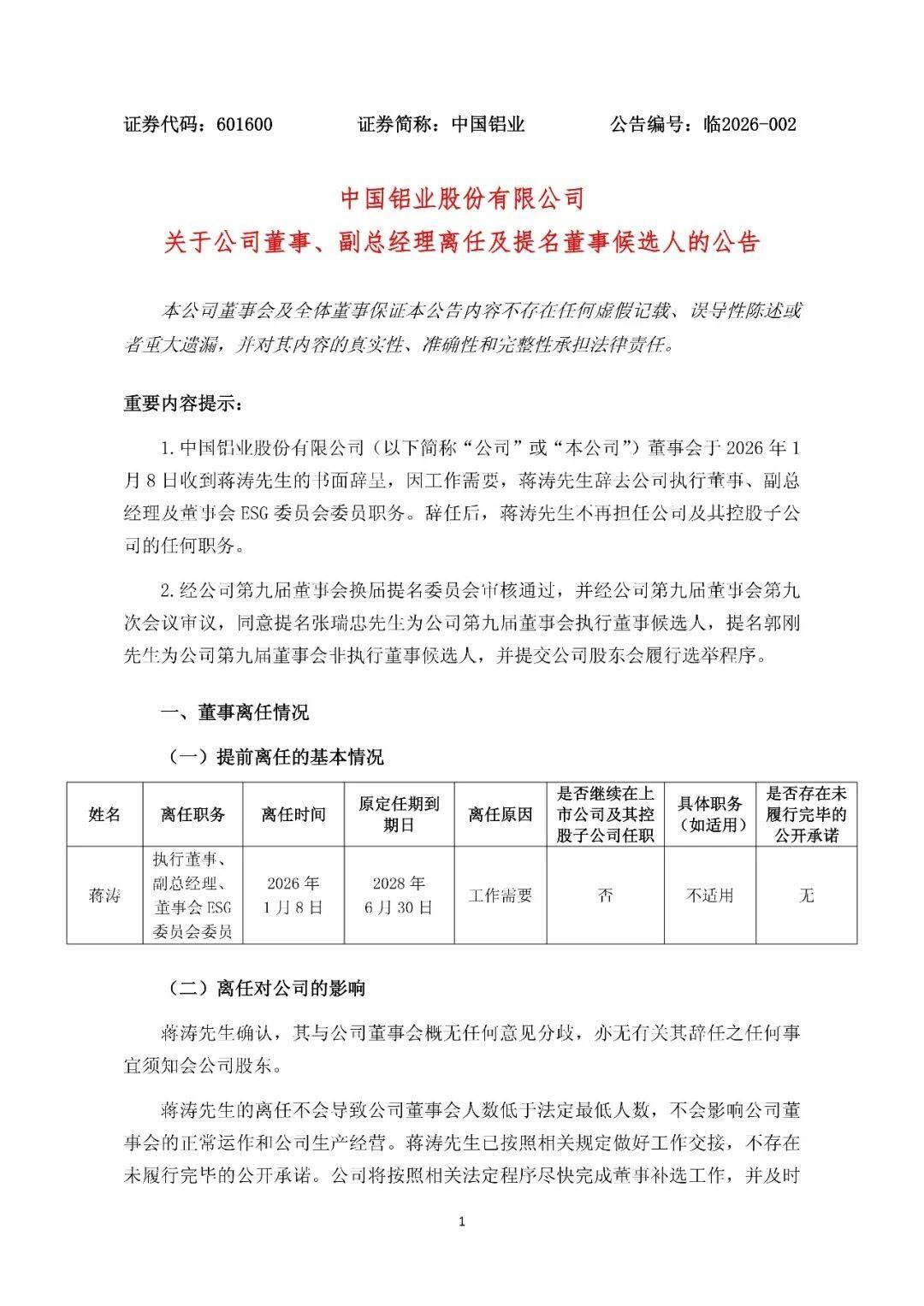 证券代码:601600 证券简称:中国铝业 公告编号:临2026-002 中国铝业股份有限公司 关于公司董事、副总经理离任及提名董事候选人的公告 蒋涛辞去中国铝业股份有限公司(以下简称"中国铝业")执行董事、副总经理等职务。 1月8日,中国铝业发布公告称,公司董事会当天收到蒋涛的书面辞呈,因工作需要,蒋涛辞去公司执行董事、副总经理等职务。辞任后,蒋涛不再担任公 司及其控股子公司的任何职务。 公司董事会同意提名张瑞忠为公司第九届董事会执行董事候选人,提名郭刚为公司第九届董事会非执行董事候选人,并提交公司股东会履行选举程序。 本公司董事会及全体董事保证本公告内容不存在任何虚假记载、误导性陈述或 者更大遗漏,并对其内容的真实性、准确性和完整性承担法律责任。 (二)离任对公司的影响 蒋涛先生确认,其与公司董事会概无任何意见分歧,亦无有关其辞任之任何事 宜须知会公司股东。 蒋涛先生的离任不会导致公司董事会人数低于法定最低人数,不会影响公司董 事会的正常运作和公司生产经营。蒋涛先生已按照相关规定做好工作交接,不存在 未履行完毕的公开承诺。公司将按照相关法定程序尽快完成董事补选工作,并及时 1 重要内容提示: 1. 中国铝 ...