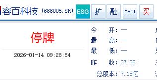 (责任编辑:孙辰炜) 中国经济网北京1月14日讯 容百科技(688005.SH)今日停牌,停牌期限为全天,停牌原因为重要事项 未公告。昨日,容百科技收报37.35元,涨幅1.66%。 | 容百科技(688005. SH) ESG | 扩 | 融 | MSCI | 本 | | --- | --- | --- | --- | --- | | 停牌 | 今最 | 开: 高 | | I | | 2026-01-14 09:28:54 | 量 | 低: | | 1 | | | 昨 | 收:37.35 | | | | | | 总股本:7.15亿 | | | ...