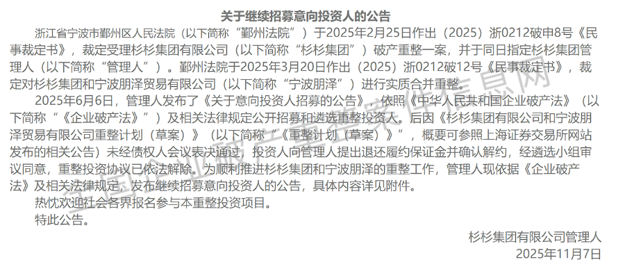 ◎记者 郭成林 杉杉集团有限公司(下称"杉杉集团")及其全资子公司宁波朋泽贸易有限公司(下称"朋泽贸易")的破 产重整案,在经历首次方案被债权人否决的挫折后,迎来了新的潜在拯救者。 11月24日晚,方大炭素公告称,公司拟作为产业协同方参与杉杉集团及其全资子公司实质合并重整投资 人招募。 这一最新动向,为这家总负债超过400亿元的民营巨头重整之路带来了新的可能性。 曲折重整路出现新玩家 据方大炭素公告,公司董事会已同意作为产业协同方参与杉杉集团的实质合并重整投资人招募,但最终 能否成为正式的重整投资人尚存在不确定性。 该公告没有进一步披露更多具体细节,包括投资金额、具体参与方式以及对杉杉集团未来发展的规划。 对于参与重整的原因,方大炭素在公告中明确,通过发挥自身在负极产业的技术、资本、渠道等优势, 作为产业协同方参与杉杉集团及其全资子公司朋泽贸易的实质合并重整,有利于公司加快负极产业布 局,实现产业链一体化和供应链长期稳定安全,充分发挥公司固态电池等新能源产业协同效应,增强公 司盈利能力,提升公司核心竞争力。 基于此,公司认为,参与杉杉集团及其全资子公司朋泽贸易的实质合并重整符合产业布局和战略发展, 预计将对公 ...