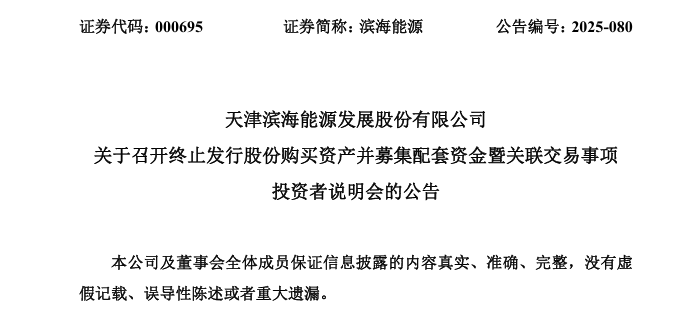Core Viewpoint - Binhai Energy has announced the termination of its plan to acquire 100% equity of Cangzhou Xuyang Chemical Co., Ltd. through a share issuance and related fundraising due to changes in market conditions and failure to reach consensus on commercial terms with transaction parties [1][4]. Group 1: Termination of Acquisition - The company held a board meeting on November 14, where it approved the termination of the asset acquisition and fundraising plan [1]. - The initial announcement regarding the acquisition was made on April 30, 2025, with subsequent meetings and disclosures leading up to the termination [4]. - The decision to terminate was made after careful consideration and negotiations, aiming to protect the interests of the company and its shareholders [4]. Group 2: Business Operations and Financial Performance - Binhai Energy's main business focuses on the research, production, and sales of lithium battery anode materials, with ongoing efforts to expand market reach and develop new materials [5]. - The company reported a revenue of 374.75 million yuan for the first three quarters of 2025, reflecting a year-on-year increase of 2.03%, while the net profit attributable to shareholders was a loss of 49.44 million yuan [5][6]. - In Q3 2025, the revenue was 139 million yuan, showing a 14% increase year-on-year, but the net profit attributable to shareholders was still a loss of 12.33 million yuan [5][6]. - The termination of the acquisition is not expected to significantly impact the company's existing operations or strategic development [5].