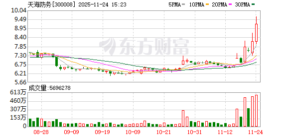 据天眼查APP显示,天海融合防务装备技术股份有限公司成立于2001年10月29日,注册资本 172802.9133万人民币。(数据宝) (文章来源:证券时报网) 数据宝统计,截至14:48,天海防务成交额44.48亿元,创上市以来新高。最新股价上涨15.83%,换手率 32.22%。上一交易日该股全天成交额为42.58亿元。 ...