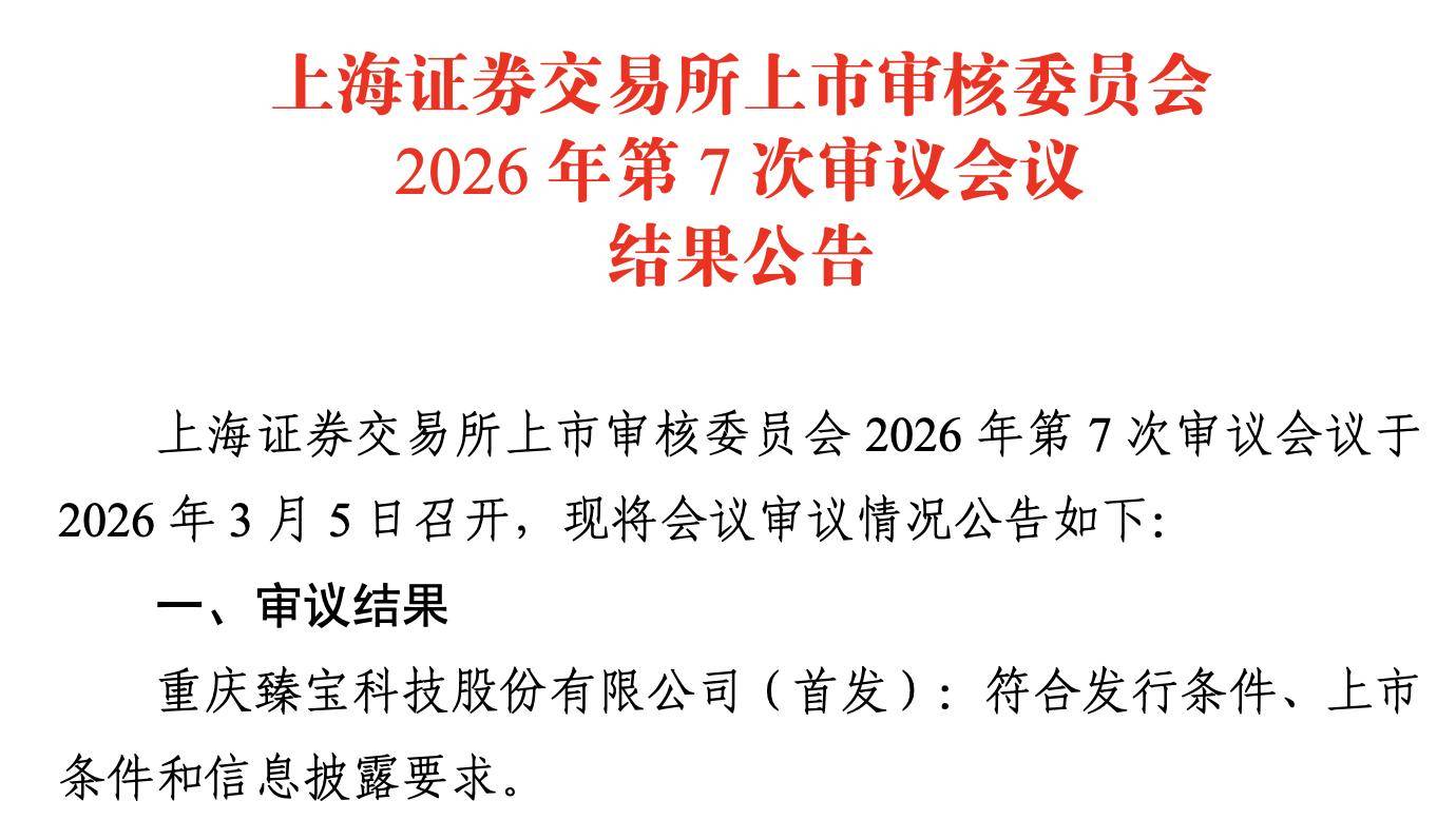 瑞财经 吴文婷3月5日,据上交所,重庆臻宝科技股份有限公司(以下简称"臻宝科技")科创板IPO过会,保荐机构为中信证券股份有限公司。 臻宝科技专注于为集成电路及显示面板行业客户提供制造设备真空腔体内参与工艺反应的零部件及其表面处理解决方案。公司主要产品为硅、石英、碳化硅 和氧化铝陶瓷等设备零部件产品,以及熔射再生、阳极氧化和精密清洗等表面处理服务。 业绩方面,2022年-2024年及2025上半年,臻宝科技实现营收分别为3.86亿元、5.06亿元、6.35亿元、3.66亿元;归母净利润分别为8155.44万元、1.09亿元、 1.52亿元、8518.47万元。 | 项目 | 2025 年 1-6 | 2024 年度 | 2023 年度 | 2022 年度 | | --- | --- | --- | --- | --- | | | 月/2025-6-30 | /2024-12-31 | /2023-12-31 | /2022-12-31 | | 资产总额(万元) | 139,345.06 | 127,166.16 | 102,386.45 | 55,233.12 | | 归属于母公司所有者权益(万元) | 10 ...
