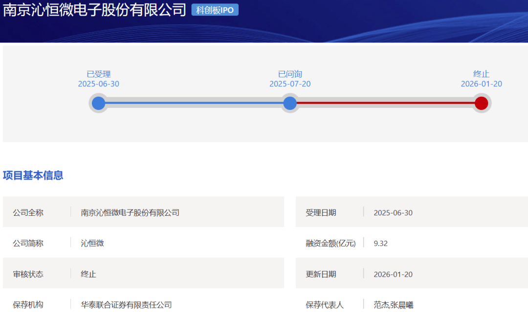 1月20日,上交所官网显示,因南京沁恒微电子股份有限公司(以下简称:沁恒微)以及保荐机构华泰联合证券撤回发行上市申请,根据《上海证券交易 所股票发行上市审核规则》第六十三条的有关规定,上交所决定终止对沁恒微首次公开发行股票并在科创板上市的审核。 公司申报IPO于2025年6月30日获得受理,2025年7月20日交易所对其发出首轮问询,但此后半年时间该公司始终未向交易所提交回复。 | 公司全称 | 南京沁恒微电子股份有限公司 | 受理日期 | 2025-06-30 | | --- | --- | --- | --- | | 公司简称 | 沁恒微 | 融资金额(亿元) | 9.32 | | 高核状态 | 终止 | 更新日期 | 2026-01-20 | | 保荐机构 | 华泰联合证券有限责任公司 | 保荐代表人 | 范杰,张晨曦 | | 会计师事务所 | 立信会计师事务所(特殊普通合伙) | 签字会计师 | 高民,刘萍,邱祐臻 | | 律师事务所 | 国浩律师(上海)事务所 | 签字律师 | 李强,陈昱申,陈雨舟 | | 评估机构 | 天源资产评估有限公司 | 签字评估师 | 邓嘉明,陈健 | 沁恒微专注于连接技 ...