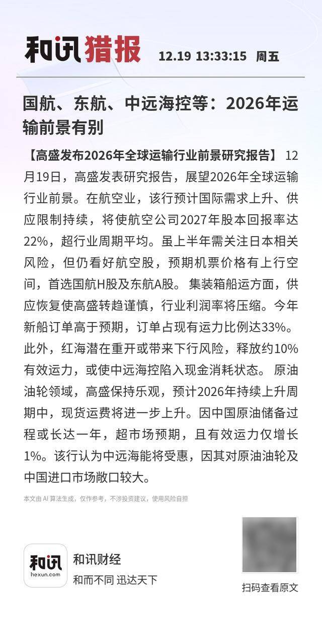 程或长达一年,超市场预期,且有效运力仅增长 1%。该行认为中远海能将受惠,因其对原油油轮及 中国进口市场敞口较大。 本文由 Al 算法生成,仅作参考,不涉投资建议,使用风险自担 【高盛发布2026年全球运输行业前景研究报告】12月19日,高盛发表研究报告,展望2026年全球运输行 业前景。在航空业,该行预计国际需求上升、供应限制持续,将使航空公司2027年股本回报率达22%, 超行业周期平均。虽上半年需关注日本相关风险,但仍看好航空股,预期机票价格有上行空间,首选国 航H股及东航A股。集装箱船运方面,供应恢复使高盛转趋谨慎,行业利润率将压缩。今年新船订单高 于预期,订单占现有运力比例达33%。此外,红海潜在重开或带来下行风险,释放约10%有效运力,或 使中远海控陷入现金消耗状态。原油油轮领域,高盛保持乐观,预计2026年持续上升周期中,现货运费 将进一步上升。因中国原油储备过程或长达一年,超市场预期,且有效运力仅增长1%。该行认为中远 海能将受惠,因其对原油油轮及中国进口市场敞口较大。 本文由 AI 算法生成,仅作参考,不涉投资建议,使用风险自担 和讯财经 和而不同 迅达天下 扫码查看原文 ...
