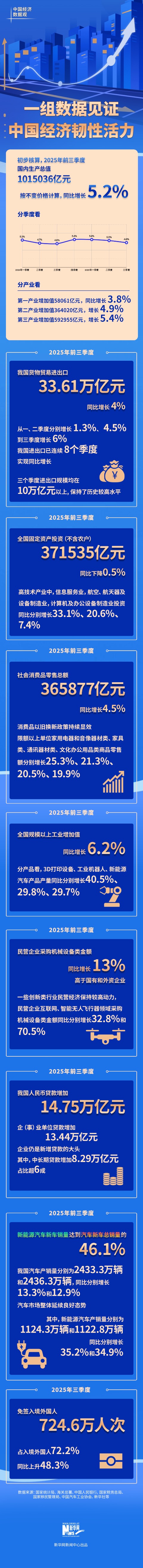 我国货物贸易进出口 33.61万亿元 中国经济 数据观 4 B X E J . THE U 国经济韧性活力 ■■ 初步核算,2025年前三季度 国内生产总值 1015036亿元 按不变价格计算,同比增长 5.20/0 分季度看 5.49 5.4% 5.39 5.2% 二季度 三季度 四季度 2026年一季度 二季度 三季度 2024年一季度 分产业看 第一产业增加值58061亿元,同比增长 3.8%o 第二产业增加值364020亿元,增长4.9%0 第三产业增加值592955亿元,增长5.4%0 同比增长 4% 从一、二季度分别增长 1.3%、4.5% 到三季度增长 6% 我国进出口已连续 8个季度 实现同比增长 2025年前三季度 2025年前三季度 社会消费品零售总额 365877亿元 同比增长4.5% 消费品以旧换新政策持续显效 限额以上单位家用电器和音像器材类、家具 类、通讯器材类、文化办公用品类商品零售 额分别增长25.3%、21.3%、 20.5%、19.9% 2025年前三季度 全国规模以上工业增加值 同比增长 6.2% 分产品看,3D打印设备、工业机器人、新能源 汽车产品产量同比分别增长40. ...