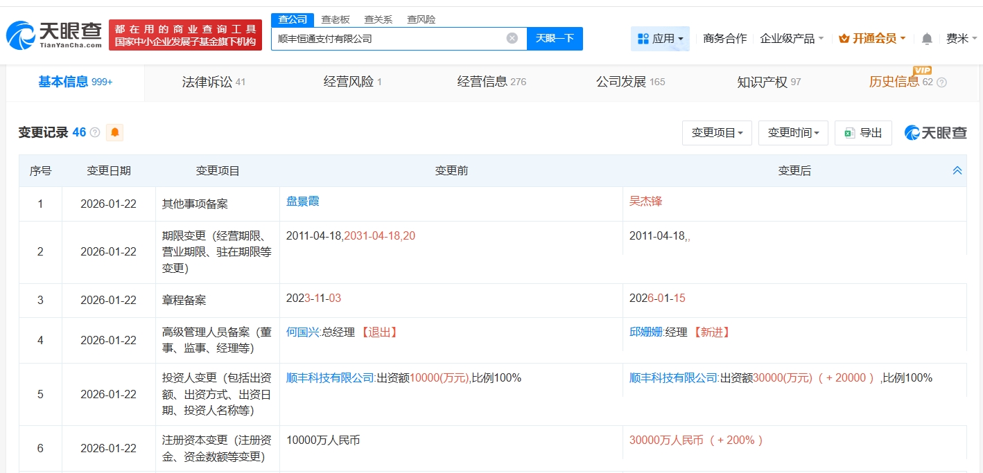 | | 都在用的商业查询工具 | 音风险 草公司 童老板 直关系 | | | | | | --- | --- | --- | --- | --- | --- | --- | | | 家中小企业发展子其全旗下机构 | 顺丰恒通支付有限公司 | | × 大眼一下 | 脂 应用 ▼ 商务合作 | | | 基本信息 999+ | 法律诉讼 41 | 经营风险 1 | | 经营信息 276 | 公司发展 165 知识 | | | 变更记录 46 ? ● | | | | | | 变更项目 - | | 序号 变更日期 | 变更项目 | | 变更前 | | | | | 1 2026-01-22 | 其他事项备案 | 盘景霞 | | | 吴杰锋 | | | 2 2026-01-22 | 期限变更(经营期限、 营业期限、驻在期限等 | 2011-04-18,2031-04-18,20 | | | 2011-04-18,, | | | | 变更) | | | | | | | 3 2026-01-22 | 章程备案 | 2023-11-03 | | | 2026-01-15 | | | | 高级管理人员备案(董 | 何国兴总经理 【 ...