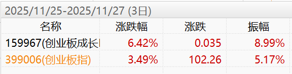 按申万一级行业分类,创业板成长ETF跟踪的指数权重集中于通信(36.69%)、电力设备(20.11%)、电子(12.66%)、非银金融(10.96%)、计算 机(9.05%)等板块。重仓中际旭创、新易盛、胜宏科技等强势股。 从估值层面来看,创业板成长ETF跟踪的创成长最新市盈率(PE-TTM)仅37.61倍,处于近10年36.77%的分位,即估值低于近10年63.23%以上的时间, 估值适中。建议逢低关注。 早盘A股市场震荡调整,截至上午10:27分纷纷翻红。半导体、卫星板块涨幅居前。 近期表现强势的创业板成长ETF 下跌0.34%,在20日均线附近震荡蓄势。近3个交易日创业板成长ETF累计上涨6.42%,同期创业板指数上涨3.49%,超 额涨幅近3个百分点。 | 2025/11/25-2025/11/27 (3日) | | | | | --- | --- | --- | --- | | 涨跌幅 | | | | | 159967(创业板成长I | 6.42% | 0.035 | 8.99% | | 399006(创业板指) | 3.49% | 102.26 | 5.17% | 从历史表现来看,创业板成长ETF ...