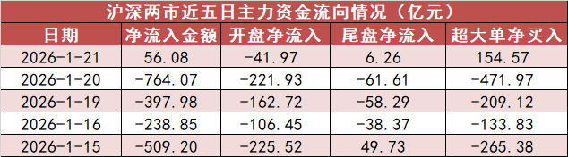 盘后数据出炉。 1月21日,A股市场整体上涨。截至收盘,上证指数报4116.94点,上涨0.08%;深证成指报14255.13点,上涨0.7%;创业板指数报3295.52点,上涨0.54%; 北证50指数上涨0.14%。 1.A股市场主力资金净流入56.08亿元 今日A股市场主力资金开盘净流出41.97亿元,尾盘净流入6.26亿元,A股市场全天主力资金净流入56.08亿元。 | | | 沪深两市近五日主力资金流向情况(亿元) | | | | --- | --- | --- | --- | --- | | 日期 | | | 净流入金额 开盘净流入 尾盘净流入 超大单净买入 | | | 2026-1-21 | 56. 08 | -41.97 | 6.26 | 154. 57 | | 2026-1-20 | -764. 07 | -221.93 | -61.61 | -471.97 | | 2026-1-19 | -397.98 | -162.72 | -58. 29 | -209.12 | | 2026-1-16 | -238.85 | -106. 45 | -38. 37 | -133.83 | | 2026- ...