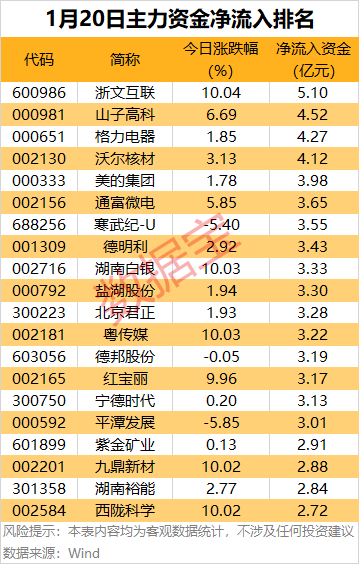 6个行业主力资金净流入。 A股三大指数今日(1月20日)走势分化,行业板块涨少跌多,贵金属、化学原料、水泥建材、化纤行 业涨幅居前,通信设备、光伏设备、航天航空、电源设备、电池、计算机设备、电子元件板块跌幅居 前。 从今日主力资金情况来看,沪深两市全天主力资金净流出764.07亿元。6个行业主力资金净流入,房地 产、食品饮料、商贸零售行业主力资金净流入金额均超2亿元;非银金融、银行行业主力资金净流入金 额均超1亿元;综合行业主力资金净流入4265.12万元。 25个主力资金净流出行业中,电力设备、电子、通信行业主力资金净流出金额居前,均超100亿元;国 防军工、计算机、机械设备行业主力资金净流出金额均超60亿元。 9股遭主力资金净流出均超9亿元 据证券时报·数据宝统计,从个股看,29股主力资金净流入均超2亿元,16股获主力资金净流入均超3亿 元。 浙文互联主力资金净流入5.1亿元,居首。消息面上,近日,浙文互联与字节跳动旗下巨量引擎合作共 建的"派智"灵动数字人,在2025年累计消耗量已突破2.5亿元,同比实现5倍增长,标志着数字人在营销 场景的商业化应用进入成熟阶段。 山子高科、格力电器、沃尔核材主力资金分 ...
