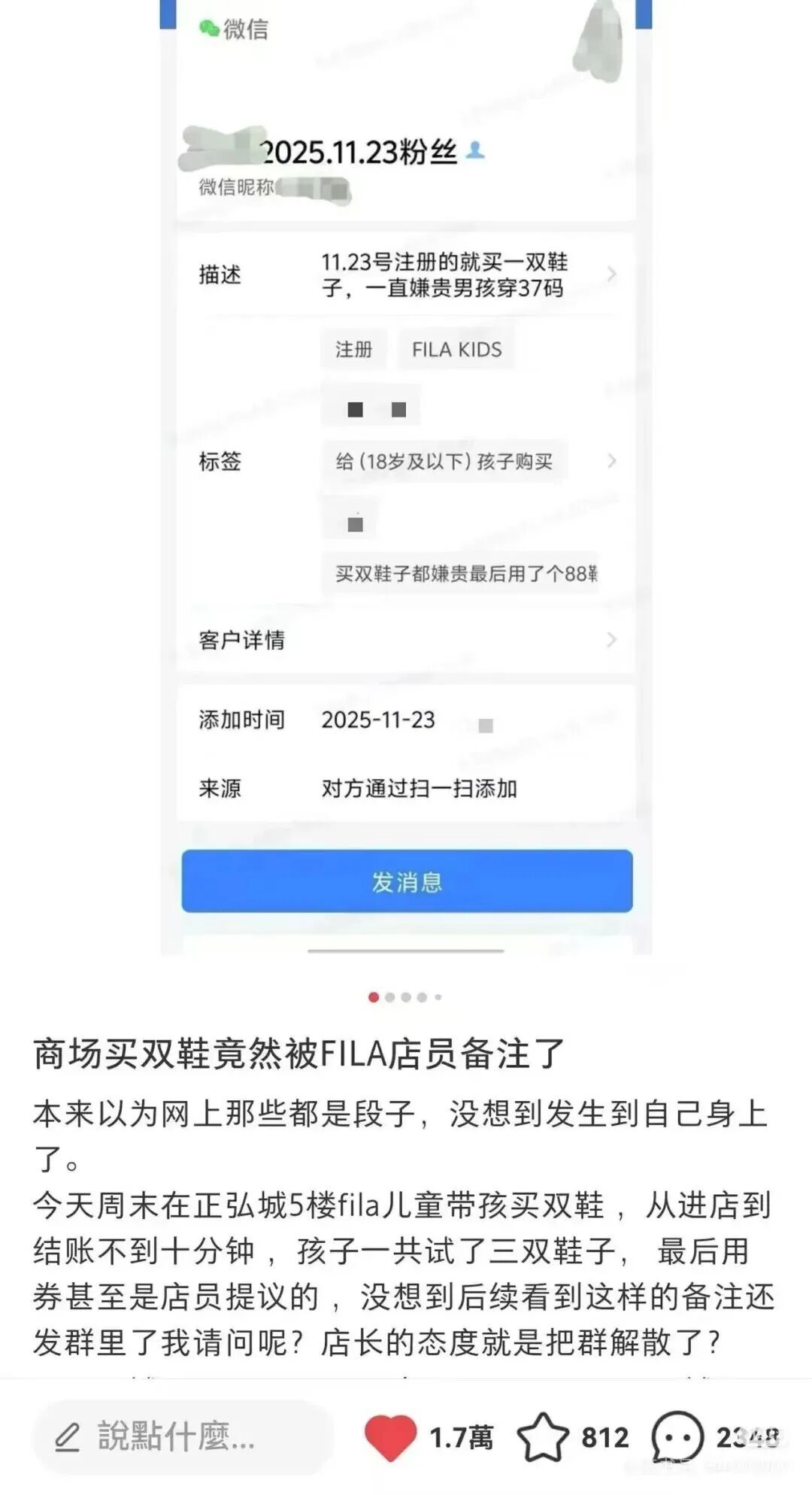 店员备注顾客“买双鞋子都嫌贵”,还发到会员群!斐乐官方致歉