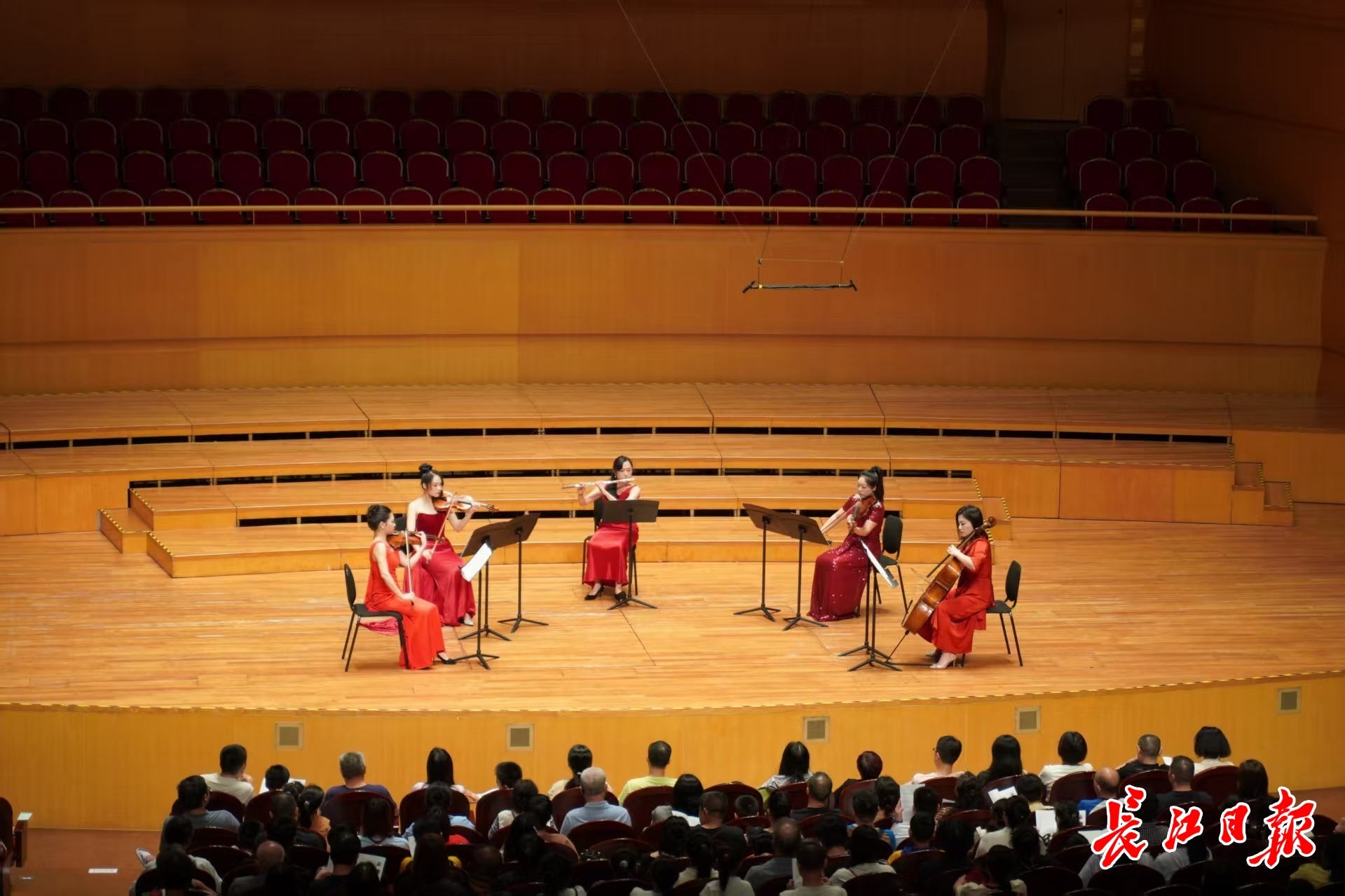 来自北京的游客刘柳,特意带着 6 岁的女儿专程前来观演。"早就听说琴台音乐厅是世界顶级的演出场地,女儿最近刚好在学习《赛 马》和《我的祖国》,我想让她在这样专业的环境里,亲身感受音乐的力量与魅力。" 刘柳的想法,道出了不少观众的心声。 当演出进入尾声,最后一曲《我的祖国》旋律响起时,全场观众不约而同地随节奏轻和,现场氛围温馨而热烈。武汉观众谢先生走出 音乐厅时仍难掩激动:"这些歌从小听到大,在国庆这个特殊的日子里现场聆听,更是深受触动,堪称视觉和听觉的双重享受。" 10月2日晚7时许,琴台音乐厅内华灯璀璨,乐声飞扬。湖北交响乐团室内乐团带来的"红旗颂——中国经典作品音乐会"在此深情上 演。一曲激昂磅礴的《红旗颂》拉开演出序幕,《赛马》《梁祝》《茉莉花》《我的祖国》等承载民族记忆的经典旋律接连奏响,为观众 打造了一场震撼心灵的视听盛宴。 演出现场 湖北交响乐团由歌剧《洪湖赤卫队》管弦乐队发展而来,六十余年来,乐团足迹遍布全国,用音乐传递荆楚之声。此次演出中,该团 青年小提琴演奏家王舒担任第一小提琴,与湖北多位优秀演奏家默契配合,以精湛的技艺为这些经典曲目注入了新的艺术活力。 这场精彩的演出,只是武汉国庆音乐盛宴 ...