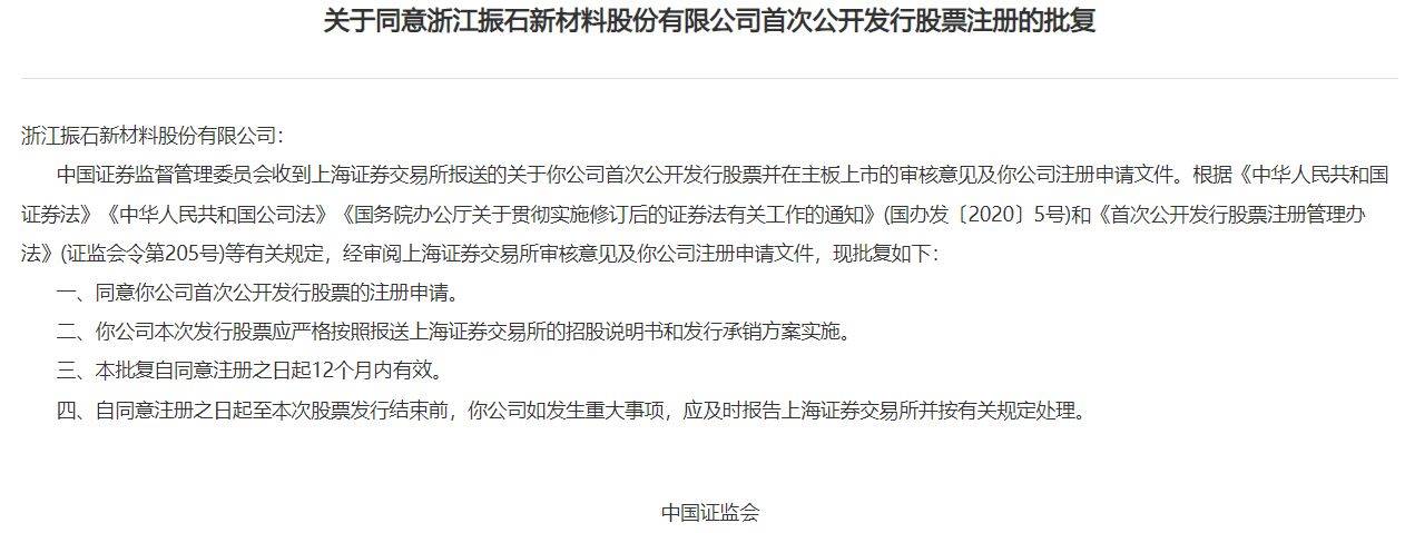 沪市主板企业振石股份IPO获注册