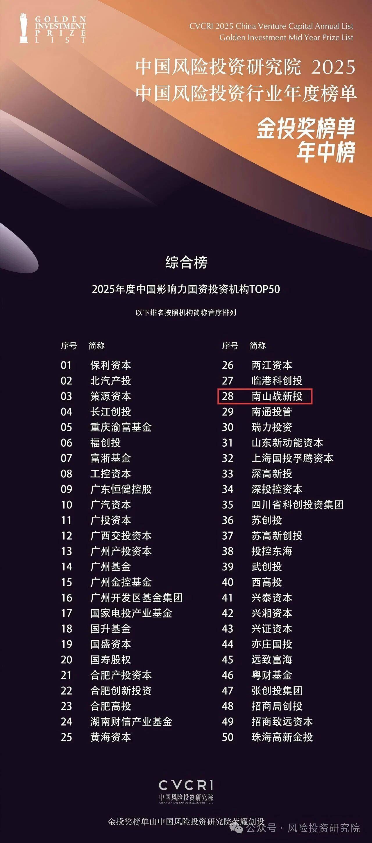 深圳商报·读创客户端记者 郑恺 近日,中国风险投资研究院权威发布"2025中国风险投资行业年度榜单·金投奖榜单·年中榜"。深圳市南山战略新兴产业投资有限公司(简称:南山战新投) 实力入选"2025年度中国影响力国资投资机构TOP50",行业影响力获权威认可。 | 序号 | 简称 | 序号 | 简称 | | --- | --- | --- | --- | | 01 | 保利资本 | 26 | 两江资本 | | 02 | 北汽产投 | 27 | 临港科创投 | | 03 | 策源资本 | 28 | 南山战新投 | | 04 | 长江创投 | 29 | 南通投管 | | 05 | 重庆渝富基金 | 30 | 瑞力投资 | | 06 | 福创投 | 31 | 山东新动能资本 | | --- | --- | --- | --- | | 07 | 富浙基金 | 32 | 上海国投孚腾资 | | 08 | 工控资本 | 33 | 深高新投 | | 09 | 广东恒健控股 | 34 | 深投控资本 | | 10 | 广汽资本 | 35 | 四川省科创投资 | | 11 | 广投资本 | 36 | 苏创投 | | 12 | 广 ...