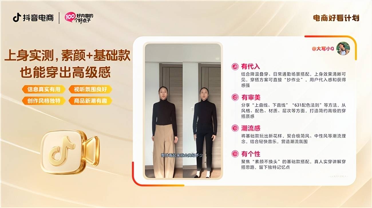 新年伊始,"马上发财""马上开运"等话题热议不断,生肖马相关的好内容热度持续飙升,催生出消费新趋势,引发用户纷纷下单相关好物。同时,短剧、团 播等创新形式打破传统带货边界,营造出鲜活的消费场景,为用户带来更新奇、优质的消费体验。真实、好看、有趣的好内容,更能激活消费兴趣,让生意 成交水到渠成。 当好内容的价值愈发凸显,作者们如何实现好内容的高效创作?为助力更多作者掌握生产好内容的方法,抖音电商升级「电商好看计划」,围绕"信息真实 有用、视听氛围良好、创作风格独特、商品新潮有趣"四大维度,为作者指出清晰的内容提质方向。同时,平台甄选出各行业的好看内容,将其中的创意亮 点与思路整理收录进「好内容的100个好点子」案例集,为作者们持续提供灵感。 用心打造的好内容,值得被更多人看见。在本期专栏中,我们将聚焦8大行业的标杆商家,从以上四大维度深度拆解内容案例,提炼核心逻辑,总结出可复 用、易上手的内容创作路径,为更多商家、作者带来创作启发。 01 服饰行业:素颜实测"基础款",提供"高级感"穿搭方案 在服饰行业,如何通过有独特风格、审美的内容,让用户感知"基础款"服饰之美?如何细致呈现穿搭技巧,打开更多穿搭可能性,让用 ...
