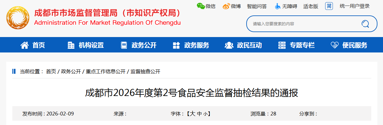 成都市2026年度第2号食品安全监督抽检结果的通报
