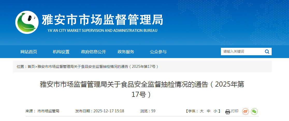 四川省雅安市市场监督管理局关于食品安全监督抽检情况的通告(2025年第17号)