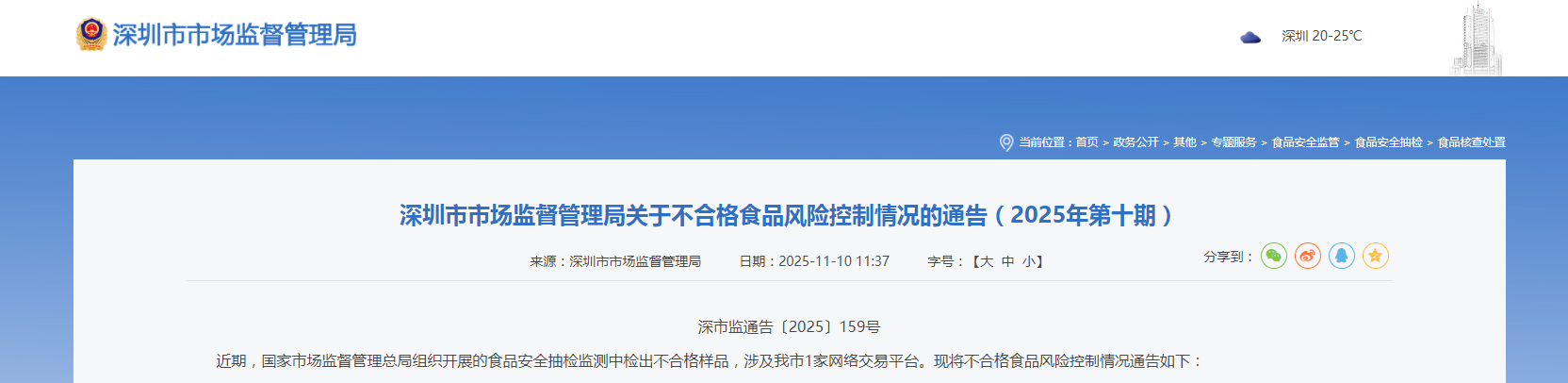 深圳市市场监督管理局关于不合格食品风险控制情况的通告(2025年第十期)
