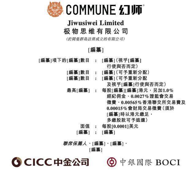 瑞财经 吴文婷近日,极物思维有限公司(以下简称"极物思维"或"COMMUNE幻师")在港交所递交招 股书,中金公司、中银国际为联席保荐人。 COMMUNE幻师是一个餐酒吧概念品牌,融合了匠心饮品、精选佳肴与精心营造的氛围空间,致力于 重新定义饮酒、用餐与聚会体验。 公司白天为顾客提供质优价美的多样化食品,入夜后,门店则转变为与朋友进行餐后社交饮酒的社交聚 集地。这一结构使公司能够适配多元的消费群体与消费场景,无论是家庭聚餐、亲密社交、团队建设还 是夜间酒市场景,皆可全面覆盖。 | # ] 【 的[ 開發] 就日 : [編纂]( 免于[編素] | | --- | | 行使與否而定) | | [編纂]數目 : [編纂](可予重新分配) | | [編纂]數目 : [編纂](可予重新分配 | | 及視乎[編纂]行使與否而定) | | 最高[編纂]:每股[編纂][編纂]港元,另加1.0% | | 經紀佣金、0.0027%證監會交易 | | 徵費 · 0.00565%香港聯交所交易費及 | | 0.00015%會財局交易徵費(須於 | | [編纂]時以港元繳足, | | 多繳股款可予退還) | | 面值 : 每股[0.0 ...