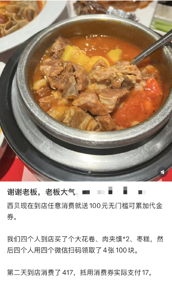 西贝一时半会儿还闲不下来,它也不敢闲下来。 舆论的火药桶炸了大半月,贾国龙清空多个社交账号躲进幕后,公关团队终于能挽起袖子干点正经事 了。 可惜舆论场上的负面声音像粘在鞋面的口香糖,甩不掉又碍眼。 能不能彻底扭转局面谁也不敢打包票,但有些事儿总得硬着头皮上。 比如降价、发券、换皮肤……一套操作猛如虎,还是压不住舆论的冷嘲热讽,但用网友的话说,"总比接 着和消费者吵架强"。 1 变脸 预制菜风波闹了半个多月,西贝终于意识到硬刚只会火上浇油。 9月底,贾国龙清空社交媒体,退居二线,西贝的补救措施才算真正启动。 第一步是撒币。 国庆前推出"西贝请您吃饭"活动,到店消费就送100元无门槛代金券,让人均150元的西贝突然冒出"4人 实付17元吃一桌"的羊毛党。 图源:小红书 这招直接让冷清的门店排起长队,北京有店铺午市等位半小时,杭州有门店甚至排到3小时。 但西贝清楚,价格战只能暂时拉人,留人得靠形象翻新。 近日,有网友发现西贝石景山万达店的招牌悄悄换了色。 原本热烈的红白Logo变成绿白色,"西贝莜面村"的标识简化为"西贝XIBEI",下面还加了行标 语"我从草原来",试图用草原意象强调自然、健康。 可惜网友压根不买 ...
