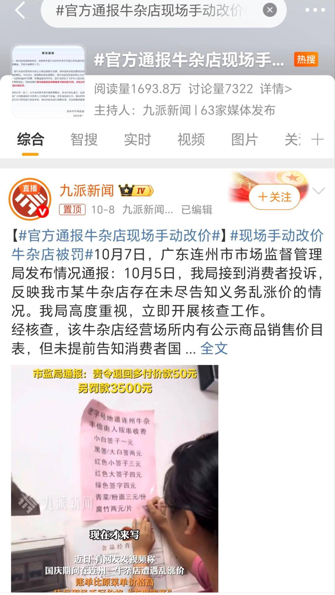 据悉,国庆节假期期间,一名消费者带着家人走进当地一家牛杂店就餐。结账时,消费者发现账单金额与店内墙上悬挂的价目表严重不符,实际结算时每 串都比公示价目表多收了1元。当消费者提出质疑,店主才回应假期"整条街都涨价",并且不断催促买单。为留存证据,消费者拍摄价目表,没想到店主 竟当场拿起笔,在墙上的价目表上直接涂改价格,当消费者告知"已拨打 12315",店主态度嚣张:"你打吧!" 据当地市场监督管理局发布的情况通报,10月5日,该局接到消费者投诉,反映该市某牛杂店经营者存在未尽告知义务乱涨价的情况。经核查,该牛杂店 经营场所内有公示商品销售价目表,但未提前告知消费者国庆节期间价格上涨的情况。10月4日,消费者到店消费时,该牛杂店经营者按其公示价目表每 串加收一元的标准进行结算,结算金额为203元,该行为违反了《中华人民共和国价格法》有关条款规定。目前该局已责令其退回该消费者多付的价款50 元,并处以罚款3500元的行政处罚。 商家别抱侥幸心理,当守护公平消费 现场手动改价牛杂店被罚 图源 新浪微博 近日,"现场手动改价牛杂店被罚"引发关注,"官方通报牛杂店现场手动改价"登上微博热搜。10月14日,江苏省消保委发 ...