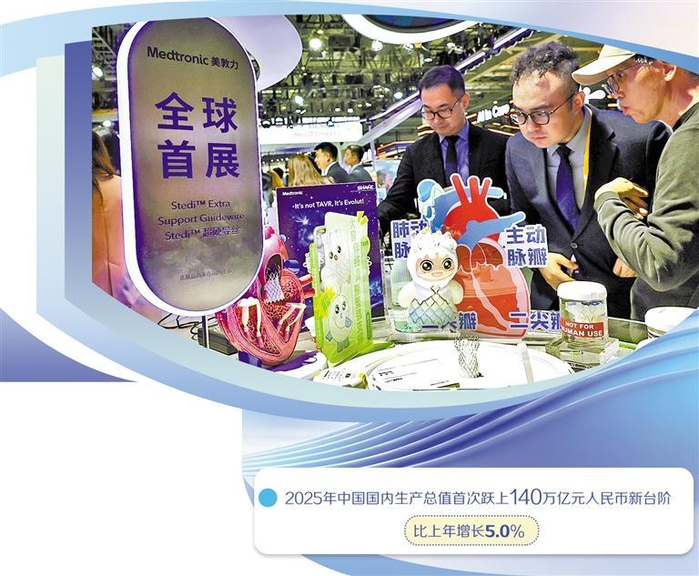 参观者在第八届中国国际进口博览会美敦力公司一款超硬导丝产品展台前驻足观看,这是该产品的全球首 展。 新华社记者 方 喆摄 中国国家统计局日前发布数据显示,2025年中国国内生产总值首次跃上140万亿元人民币新台阶,比上年增长 5.0%。多位跨国企业负责人表示,中国经济顶压前行、稳中有进、向新向优,展现出的韧性、活力与确定 性,增强了企业对中国市场的信心,也印证了中国市场蕴含着广阔机遇,企业将进一步深化在华布局,共享 中国经济发展红利。 稳中有进显韧性 2025年,中国经济增势稳健,高质量发展基础不断夯实,在创新驱动、产业提质、数字赋能、绿色转型等方 面取得不少新进展。多位跨国企业负责人认为,中国经济韧性强、底气足,这种建立在结构优化基础上的可 持续增长,更具长期价值。 达索系统大中华区总裁张鹰表示,在全球经济环境复杂多变的形势下,中国经济展现出强大韧性与结构升级 的澎湃动能,其意义远超单一增长数字本身。这不仅深刻印证了中国市场是全球经济的"稳定之锚",更彰显 了其作为面向未来"创新之源"的独特价值。 罗克韦尔自动化(中国)有限公司总裁石安认为,从2025年的经济表现中可以清晰地看到中国经济的韧性与 内生动力。 ...
