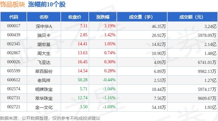 | 代码 | 名称 | 收盘价 | 涨跌幅 | 成交量(手) | 成交额(元) | | --- | --- | --- | --- | --- | --- | | 002345 | 潮宏基 | 14.96 | 1.01% | 11.38万 | 1.70亿 | | 300945 | 曼卡龙 | 66.61 | 1.01% | 15.97万 | - 3.23 Z | | 002731 | 幸华珠宝 | 12.22 | 0.58% | 5.00万 | 6120.34万 | | 665569 | 菜自股份 | 13.96 | 0.50% | 2.67万 | 3723.23万 | | 002574 | 明牌珠宝 | 5.56 | 0.18% | 6.50万 | 3614.64万 | | 600612 | XD老凤祥 | 50.07 | 0.06% | 2.05万 | 1.02亿 | | 600916 | 中国黄金 | 8.25 | 0.00% | 14.78万 | 1.22亿 | | 002867 | 周大生 | 13.43 | -0.07% | 4.17万 | 5600.81万 | | 600439 | 瑞贝卡 | ...