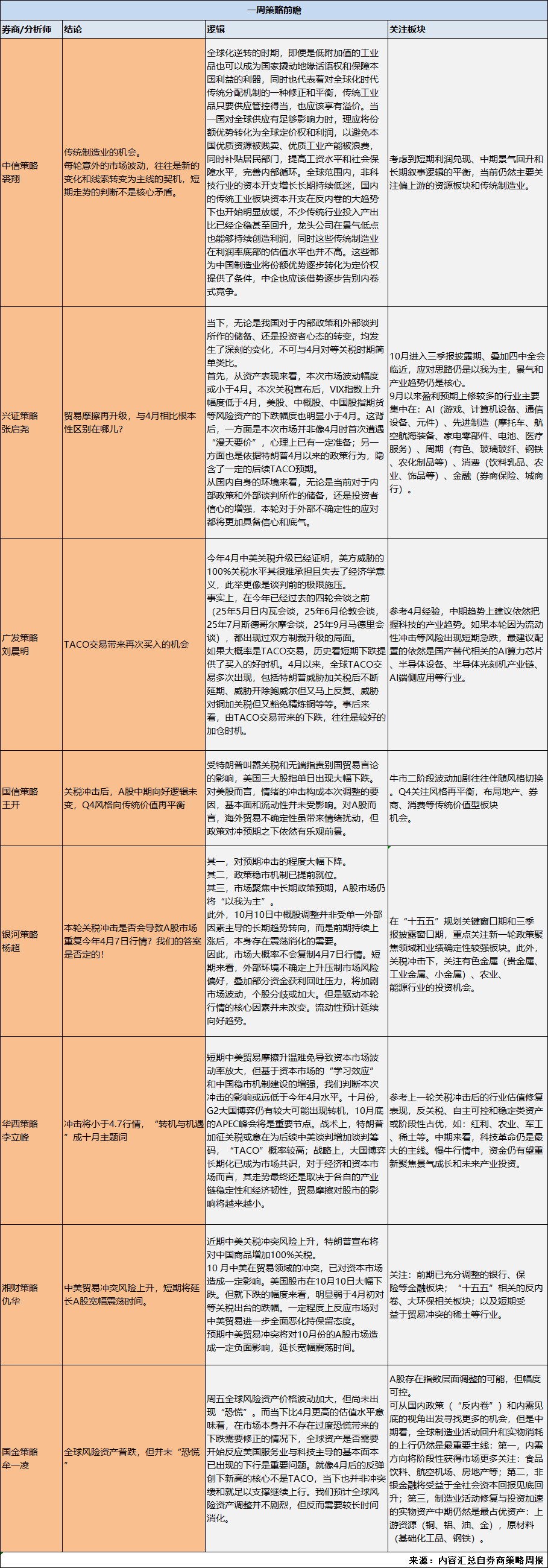 看好的方向上,稀土、内需、自主可控等或有短期催化。中期来看,科技革命仍是最大的主线。慢牛行情中,资金仍有望重新聚 焦景气成长和未来产业投资。 | | | 一周策略前瞻 | | | --- | --- | --- | --- | | 券商/分析师 | 结论 | 逻辑 | 关注板块 | | | | 国利益的利器,同时也代表着对全球化时代 | | | | | 全球化逆转的时期,即便是低附加值的工业 品也可以成为国家撬动地缘话语权和保障本 | | | | | 传统分配机制的一种修正和平衡,传统工业 | | | | | 品只要供应管控得当,也应该享有溢价。当 | | | | | 一国对全球供应有足够影响力时,理应将份 | | | | | 额优势转化为全球定价权和利润,以避免本 | | | | 传统制造业的机会。 | 国优质资源被贱卖、优质工业产能被浪费, | | | 中信策略 | | 同时补贴居民部门,提高工资水平和社会保 | 考虑到短期利润兑现、中期景气回升和 | | | 每轮意外的市场波动,往往是新的 | 障水平,完善内部循环。全球范围内,非科 | 长期叙事逻辑的平衡,当前仍然主要关 | | 禁翔 | 变化和线索转 ...