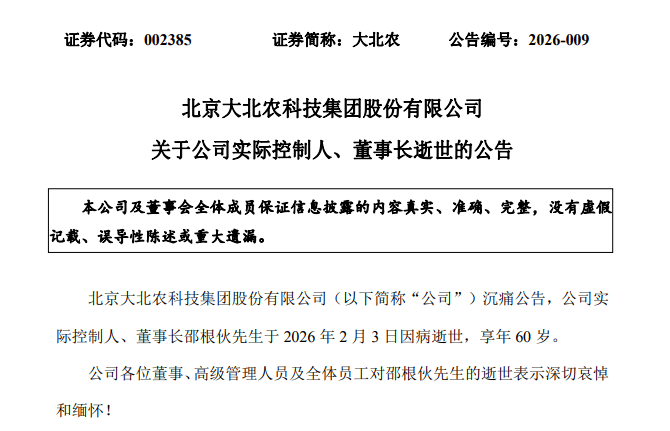 2月4日下午,大北农(002385)突然发布公告称,公司实际控制人、董事长邵根伙于2月3日因病逝世,享年60岁。 对此,大北农各位董事、高级管理人员及全体员工对邵根伙的逝世表示深切哀悼和缅怀。同时,邵根伙持有的大北农股份将按照法 律、法规办理相关手续,上市公司将及时履行信息披露义务。 大北农表示,在邵根伙逝世后,该上市公司现任董事人数由9人减少至8人,不会导致上市公司董事会成员低于法定最低人数。根据 《公司章程》的规定,由大北农副董事长张立忠代行董事长职责,直至上市公司董事会选举新任董事长为止。目前,大北农董事会、 高级管理人员正常履职,上市公司各项经营业务正常开展。 目前,大北农官网已经发布缅怀海报。 | 关于大北农 | 产业发展 新闻动态 ESG 投资者关系 | 加入我们 英 F | | --- | --- | --- | | | 深切细怀 | | | | 邵根休博 | | | | 1965年7月29日—2026年2月3日 | | 公开资料显示,邵根伙于1965年出生于浙江金华,生前为大北农集团创始人、党委书记、董事长,且拥有中关村科技企业家协会会 长,山西农业大学名誉校长,西北农林科技大学未来农业研究院 ...