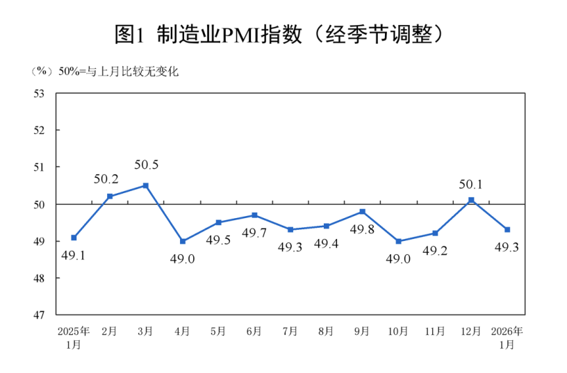国家统计局:2026年1月份中国制造业采购经理指数为49.3%