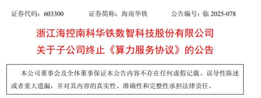 这个长假,海南华铁(603300.SH)20多万股东过得分外忐忑。9月30日晚间,公司公告称,子公司与杭州X公司签下的36.9亿元(含税)算力大单终止, 终止原因为"原协议所涉交易及设备的市场环境及供需情况已较签署时发生较大变化,且协议签订以来未收到任何采购订单"。除双方仍需对原协议及其内 容、履行及解除负有保密义务外,双方就原协议及其履行或解除不存在其他待解决事项或争议、纠纷。 首先就是公司算力业务的叙事是否还成立。在最新公告中,海南华铁表示,"(合同终止)不会影响公司在算力领域的长期部署和战略规划⋯⋯将继续推 进算力业务落地",但算力业务不能靠嘴上说说就能落地。海南华铁今年6月接受投资者调研时表示,其在智算领域的核心竞争力就包括"稳定的设备交付 能力及设备运维能力",但此次大单终止就有设备采购的原因,其所谓"稳定的设备交付能力"是否还成立? 自2024年5月宣布投资智算中心开始,海南华铁的业务重心就大幅度转向算力业务。比如,与海南省算力科技有限公司等签署战略合作协议,深化在海南 的智算业务布局;与安徽海马云签署战略合作协议,总服务金额达10亿元。就在今年9月,公司董事会还决议,启动新加坡上市,打算融资2亿 ...