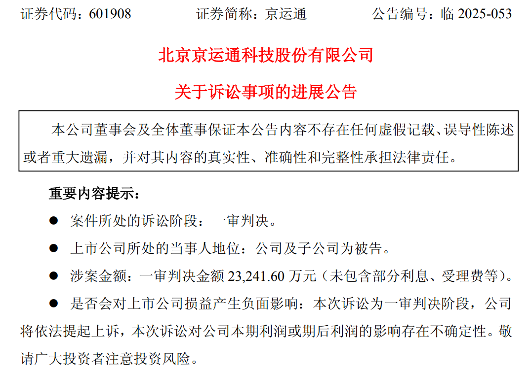 11月21日晚间,京运通(601908)发布公告,披露关于乌海市海勃湾区城市建设投融资有限责任公司对公司及公司全资子公司乌海市京运通新材料科技 有限公司的合同纠纷案进展。 公告称,公司及全资子公司乌海京运通近日收到内蒙古自治区乌海市中级人民法院的民事判决书,一审判决公司向海勃湾城投支付代建工程款2.1亿元及 2017年6月1日起至2019年8月19日资金占用利息2242万元。此外,公司还应支付2019年8月20日至实际付清之日的资金占用利息。 京运通表示,本次诉讼为一审判决阶段,公司将依法提起上诉,本次诉讼对公司本期利润或期后利润的影响存在不确定性。 本次披露的案件的背景可追溯至2017年5月,乌海市人民政府与京运通签订《乌海京运通新材料产业园项目投资协议》,约定由海勃湾城投代建厂房并以 入股形式进入项目公司,但实际操作中并未履行入股程序。海勃湾城投已完成代建服务,且相关厂房已交付乌海京运通使用,但工程款支付问题引发此 次诉讼。 京运通如今诉讼缠身。公司7月4日晚公告,公司及其子公司在过去12个月内累计涉及的诉讼和仲裁案件金额已高达10.5亿元,占公司最近一期经审计净 资产的11.73%。这些案件包括买卖合同 ...