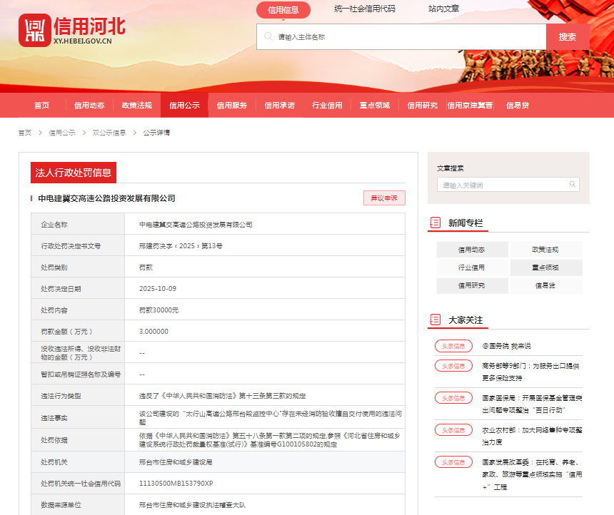 齐鲁晚报·齐鲁壹点记者于信用河北双公示信息栏获悉,10月9日,中电建冀交高速公路投资发展有限公司(下称"中电建冀交高速公司") 收罚单,处罚机关为邢台市住房和城乡建设局,处罚决定书文号:邢建罚决字﹝2025﹞第13号。 | | | 统一社会信用代码 信用信息 | 站内文章 | | | --- | --- | --- | --- | --- | | | | 〔、请输入主体名称 | | 搜索 | | 首页 信用动态 | 政策法规 信用公示 信用服务 信用承诺 行业信用 | | 重点领域 信用研究 信用京史製習 | 信易贷 | | 虹枝片公 < 奥是后公区 < 北公用是 < 百如 | | | | | | 法人行政处罚信息 | | | 文一端房 | | | 中电建翼交高速公路投资发展有限公司 | | | 请输入关键词 共出示陈 | Q | | 企业各称 | 可以監在雖然免於該公與龍松鳳德世中 | | 国 新闻专栏 | | | 行政处罚决定书文号 | 那建君决字:2025;第13号 | | 信用动态 | 政策法规 | | 处罚类别 | 開放 | | 行业信用 | 三点领域 | | 处罚决定日期 | 2025-10-09 ...