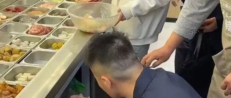 工作人员脚踩食材展柜,“天价麻辣烫”杨国福再曝食安问题