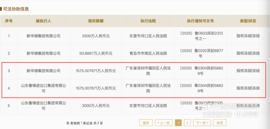 21世纪经济报道记者肖夏 21世纪经济报道记者注意到,国家企业信用信息公示系统近日披露,广东省深圳市福田区人民法院前不久裁定,山东即墨黄酒厂有限公司(下称即墨黄酒)约 1575万元股权被依法冻结,冻结期限至2028年10月9日,被执行人正是两大股东新华锦集团和关联方山东鲁锦集团。 | ■ 司法协助信息 | | | | | | | --- | --- | --- | --- | --- | --- | | 序号 | 被执行人 | 股权数额 | 执行法院 | 执行通知书文号 | 类型 状态 | | 1 | 新华锡集团有限公司 | 2500万人民币元 | 东营市河口区人民法院 | (2025) 鲁0503民初2313 号之一 | 股权冻结冻结 | | 2 | 新华锦集团有限公司 | 50.8667万人民币元 | 青岛市市南区人民法院 | (2025) 鲁0202民初8877 를 | 股权冻结 冻结 | | ന | 新华锡集团有限公司 | 1575.007671万人民币元 | 广东省深圳市福田区人民法 院 | (2025) 粤0304民初5882 ਰੋਵੇਂ | 股权冻结 冻结 | | র্ণ | 山东鲁锦进出口集团 ...