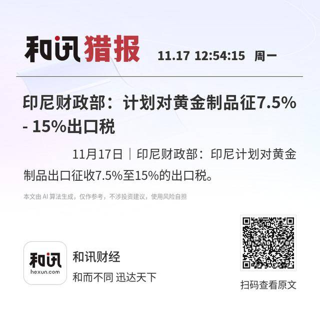11月17日|印尼财政部:印尼计划对黄金制品出口征收7.5%至15%的出口税。 本文由 AI 算法生成,仅作参考,不涉投资建议,使用风险自担 ...