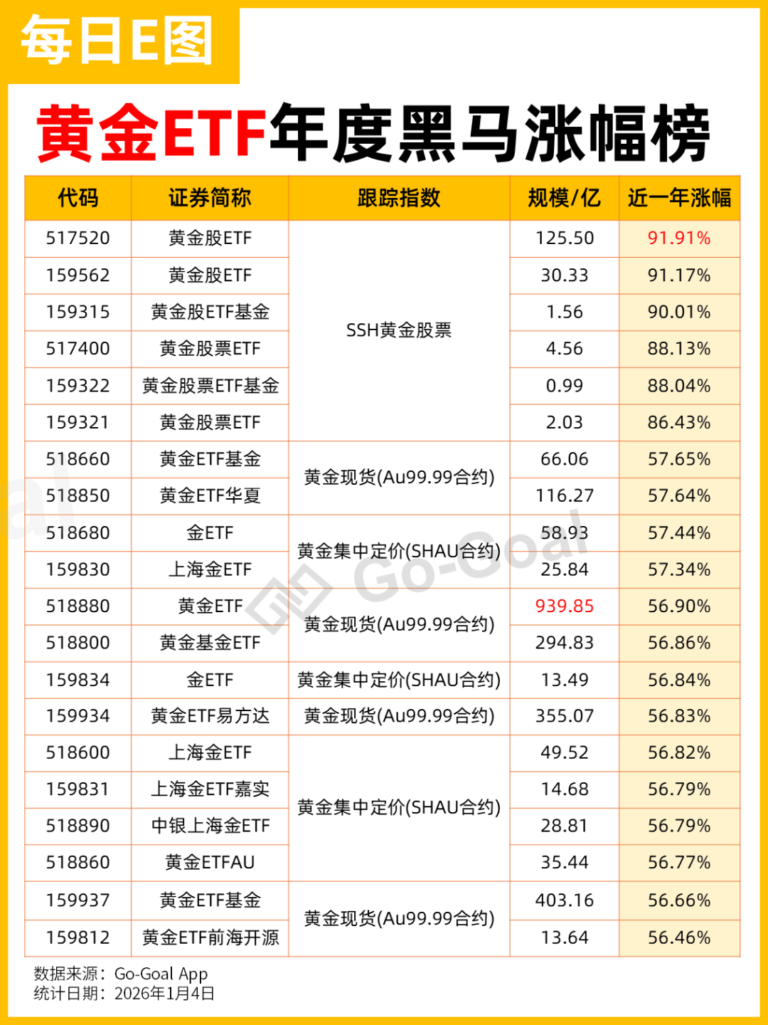 长期持有黄金类ETF的优势: 来源:市场资讯 (来源:ETF万亿指数) 地缘政治的紧张、美联储的降息预期、各国央行的持续增持,让金银价格全年飙升 黄金市场里许多投资者,金价上涨心跳加速冲进场,待到金价回调又开始手心冒汗"是不是见顶了"。 从整体看,黄金的核心属性——长期保值与风险对冲 黄金类ETF完美继承了黄金的这些长期属性,因此更适合作为长期资产配置的工具 平滑短期波动,捕捉长期趋势 为何说短线挑战大? 并附上了近一年的涨幅与近三个月资金流入情况 每日尾客 黄金ETF年度黑马涨幅榜 | 代码 | 证券间称 | | 规模/亿 | | | --- | --- | --- | --- | --- | | 517520 | 黄金股ETF | SSH黄金股票 | 125.50 | 91.91% | | 159562 | 黄金股ETF | | 30.33 | 91.17% | | 159315 | 黄金股ETF基金 | | 1.56 | 90.01% | | 517400 | 黄金股票ETF | | 4.56 | 88.13% | | 159322 | 黄金股票ETF基金 | | 0.99 | 88.04% | | 1 ...
