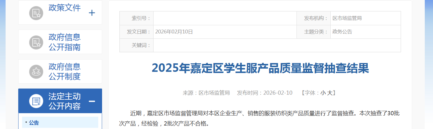 2025年上海市嘉定区学生服产品质量监督抽查结果公布
