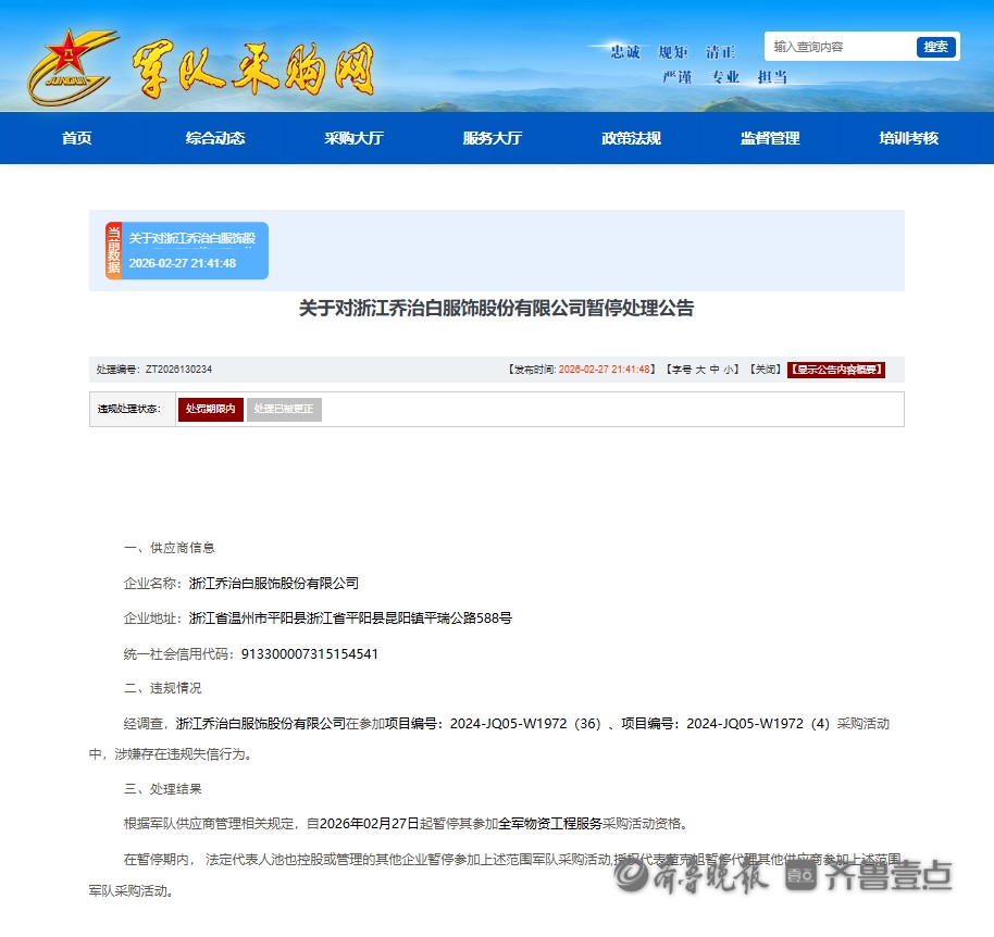 近日,军队采购网发布关于对浙江乔治白(002687)服饰股份有限公司暂停处理公告。 经调查,浙江乔治白服饰股份有限公司在参加项目编号:2024-JQ05-W1972(36)、项目编号:2024-JQ05-W1972(4)采购活动中,涉嫌存在违规失信行 为。 根据军队供应商管理相关规定,自2026年02月27日起暂停其参加全军物资工程服务采购活动资格。 在暂停期内,法定代表人池也控股或管理的其他企业暂停参加上述范围军队采购活动,授权代表董克旭暂停代理其他供应商参加上述范围军队采购活动。 公告概要显示,暂停事由为中标后无正当理由拒不签订合同,处理部门为联勤保障部队采购管理部门。 乔治白(002687.SZ)成立于1995年,是一家集商务职业装、校服、休闲服等系列服装的研发、设计、生产、销售为一体的服饰公司,以B2B定制模式为 主,服务于各企事业单位。 公司先后荣获《中国名牌产品》、《中国驰名商标》、《中国职业装十大领军企业》、《最具专注力服装品牌》、《中国西服(含衬衫)十强企业》、 《全国百佳质量诚信标杆示范企业》、《全国售后服务行业十佳单位》、《全国服装标准化工作先进单位》、《国家级守合同重信用企业》、《国家级 ...