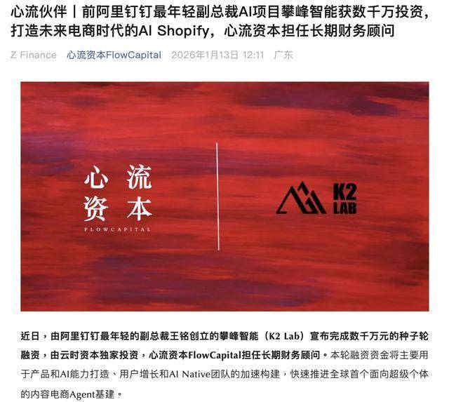 Core Insights - K2 Lab, founded by Wang Ming, the youngest vice president of Alibaba DingTalk, has completed a seed round financing of several tens of millions, exclusively invested by Yunshi Capital, with FlowCapital serving as a long-term financial advisor [1] Group 1: Financing and Investment - The funds from this financing round will primarily be used for product and AI capability development, user growth, and accelerating the construction of an AI Native team to advance the world's first content e-commerce Agent infrastructure aimed at super individuals [1] Group 2: Product Development - K2 Lab's first product, Moras, is the world's first fully automated commercial Agentic AI designed to help influencers monetize their content through an online reinforcement learning loop that encompasses insight, creation, and analysis [4] - Moras achieves an end-to-end automated closed loop that assists influencers in understanding content e-commerce, industry insights, product recommendations, script generation, multi-camera video production, intelligent editing, and business analysis [4] Group 3: Founding Team - The three founders of K2 Lab are core members of Alibaba DingTalk's AI innovation business, having collaborated for many years and possessing extensive experience in AI product incubation, ecosystem operation, strategic insight, and commercialization [4] - CEO Wang Ming is a serial entrepreneur and global traveler, previously serving as vice president and general manager of the open platform at DingTalk, where he led AI innovation products and ecosystem development [4] - Co-founder and CTO Zhao Xianlie has full-stack technical capabilities and platform product experience, while co-founder and CSO Tang Minglei has a rich strategic perspective in the AI sector and investment experience [4]