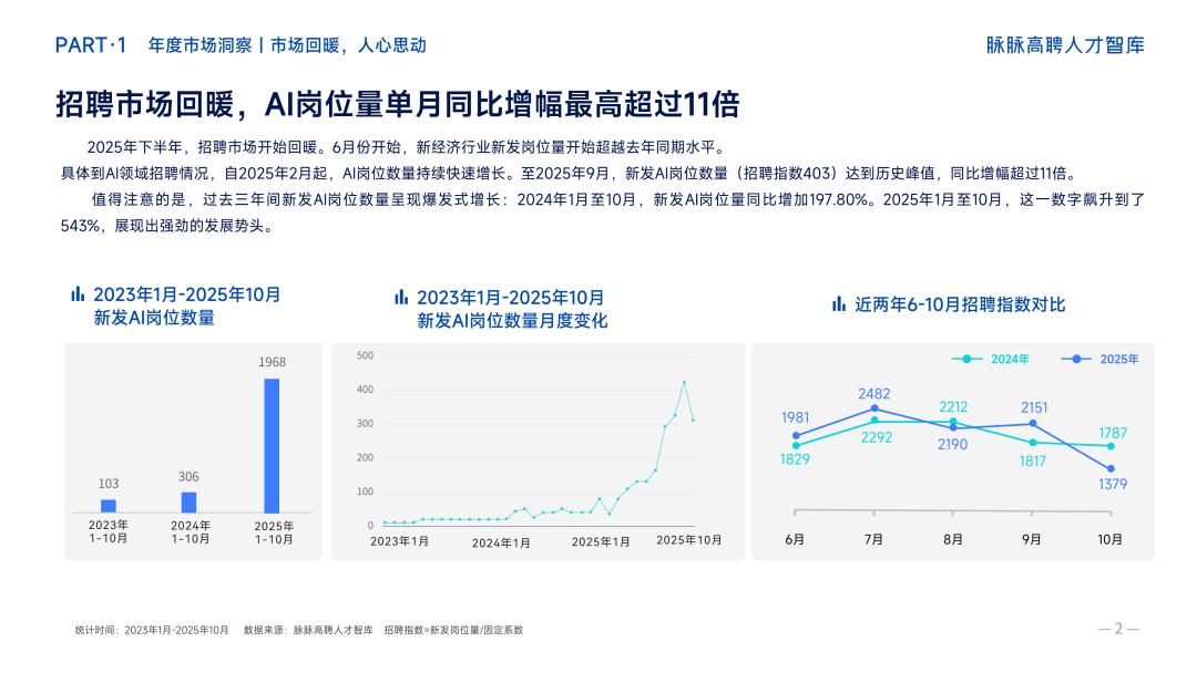 Group 1 - The recruitment market is recovering, with new job postings in the new economy sector surpassing last year's levels starting from June 2025 [1] - The AI sector has shown remarkable growth, with new AI job postings reaching a historical peak in September 2025, showing a year-on-year increase of over 11 times [2] - From January to October 2025, the number of new AI job postings increased by 543% compared to the same period in 2024 [2] Group 2 - The increase in job opportunities has led to heightened competition, with the talent supply-demand ratio in the new economy sector reaching a historical high of 2.23, indicating an average of 2.23 job seekers per position [7] - In the AI sector, the talent supply-demand ratio exceeded 1 for the first time, reaching 1.08, indicating a shift from talent shortage to surplus [7] - Nearly 20% of new job postings in non-AI roles explicitly require AI skills, with the proportion rising from 12.25% in 2024 to 19.18% in 2025 [7] Group 3 - Despite the talent surplus in AI, the sector remains attractive, with an average monthly salary of 61,764 yuan, which is 35.59% higher than the overall salary in the new economy sector [8] - AI roles dominate the highest-paying job categories, with AI scientists earning an average monthly salary of 127,225 yuan [8] - The phenomenon of "AI premium" is evident, with AIGC algorithm engineers earning 67,460 yuan, 17.81% more than regular algorithm engineers [12] Group 4 - The demand for AI talent is accelerating across various industries, with new financial technology showing the highest AI job penetration rate at 13.76% [13] - AI product manager positions have seen a staggering increase of 369.36%, indicating a strong need for professionals who can transition AI technology from "lab" to "product" [13] - Data labeling/AI training roles have also increased by 171.35%, reflecting the ongoing demand for high-quality data in AI model training [14] Group 5 - The use of AI tools among professionals has surged, with over 90% of workers using AI tools in 2025, up from 69.99% in 2024 [16] - The focus of job seekers is shifting from salary to long-term value, with an increase in attention to industry and company development prospects [20] - The proportion of non-technical roles in the AI sector has risen from 12.25% in 2024 to 17.36% in 2025, indicating broader opportunities for non-technical candidates [21] Group 6 - Companies are actively competing for AI talent, with ByteDance leading in new job postings and recruitment indices [24] - Xiaopeng Motors has a high AI job penetration rate of 19.32%, indicating a significant focus on AI-related roles [27] - The trend of AI adoption is widespread, with 79.55% of companies having implemented AI strategies [27] Group 7 - The job market landscape is changing, with cities like Chongqing emerging as new hubs for AI talent due to industrial shifts and policy support [28] - The report highlights a clear trend of AI reshaping the workplace, creating new opportunities and high returns for those prepared to embrace it [30]