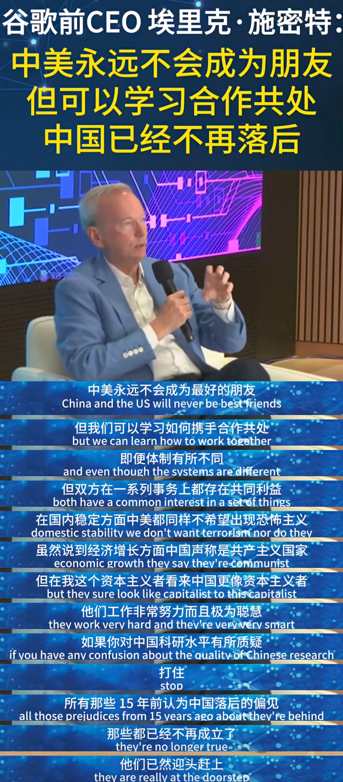 谷歌前CEO道出实情:中美永远不会成为朋友,中国已不再落后!网友:那就学习合作共处
