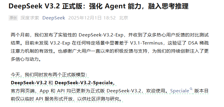 DeepSeek V3.2 正式版发布:性能比肩GPT-5 ,略低于 Gemini-3.0-Pro