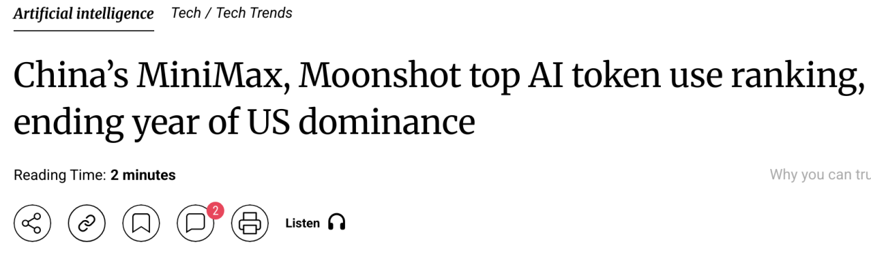 Core Insights - The M2.5 model by MiniMax has achieved a usage of 4.55 trillion tokens, making it the most popular AI model among developers globally within two weeks of its release [1] - The Kimi K2.5 model from Moonshot AI ranks second with a usage of 4.02 trillion tokens [1] - Token usage reflects the actual application scale and developer acceptance of AI models [1] Company Performance - MiniMax, Moonshot AI, and DeepSeek are the three Chinese companies that have models in the top five, collectively accounting for nearly two-thirds of the token usage in this ranking [1] - The other two models in the top five are Google's DeepMind Gemini 3 Flash Preview and Anthropic Claude Sonnet 4.5 [1]