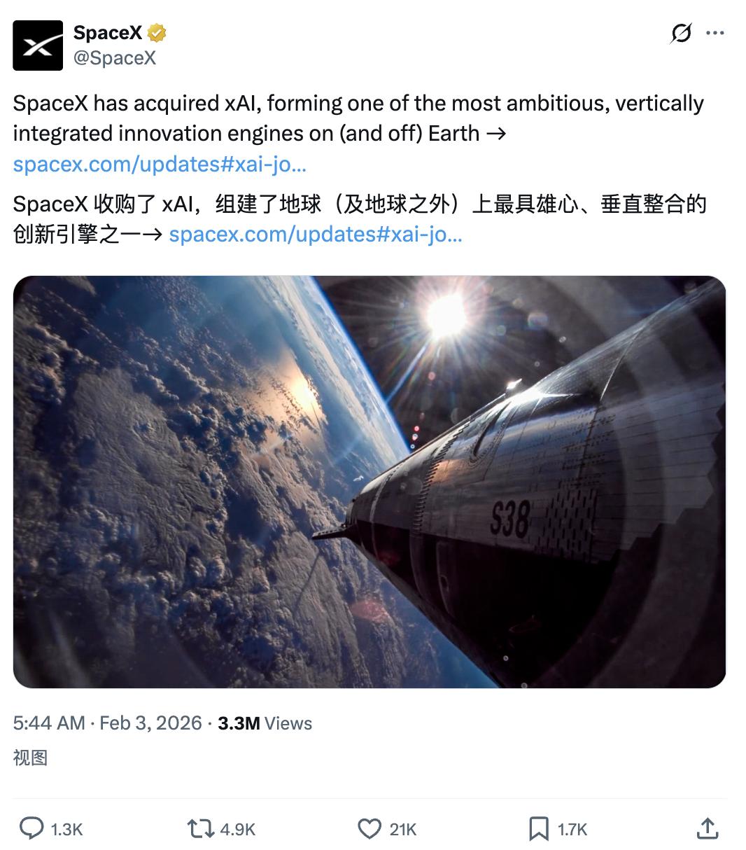 (图片来源:摄图网) 美国当地时间2月2日,全球首富埃隆·马斯克旗下太空探索技术公司(SpaceX)正式发布声明,宣布已完成对 同属其旗下的人工智能初创公司xAI的全资收购。交易完成后,xAI将成为SpaceX的全资子公司。这起轰动 全球的并购案采用全股票交易形式,合并后新实体估值高达 1.25 万亿美元,一举超越所有私营企业,成为 全球最具价值的非上市企业,标志着马斯克横跨航天、人工智能、通信领域的超级科技帝国布局迈出关键一 步。 马斯克对此次收购满怀壮志,他表示:"这笔交易将打造地球上,乃至地外最具雄心、垂直整合程度最高的 创新引擎,涵盖人工智能、火箭技术、太空互联网、直连移动设备的通信。"在他眼中,这不仅仅是SpaceX 与xAI使命的延续篇章,更是一部全新的"巨著"。他们有着更为宏大的目标——通过规模化构建一个"感知的 太阳"来理解宇宙,并将意识之光延伸至万千星辰。 马斯克在公告中表示,此次收购的核心动因,源于先进人工智能系统发展面临的现实困境。随着人工智能技 术的飞速发展,其对算力和能源的需求呈现出爆发式增长,这些需求正在迅速逼近传统地面数据中心的极 限。他指出,从长远来看,基于太空的AI(天基AI ...