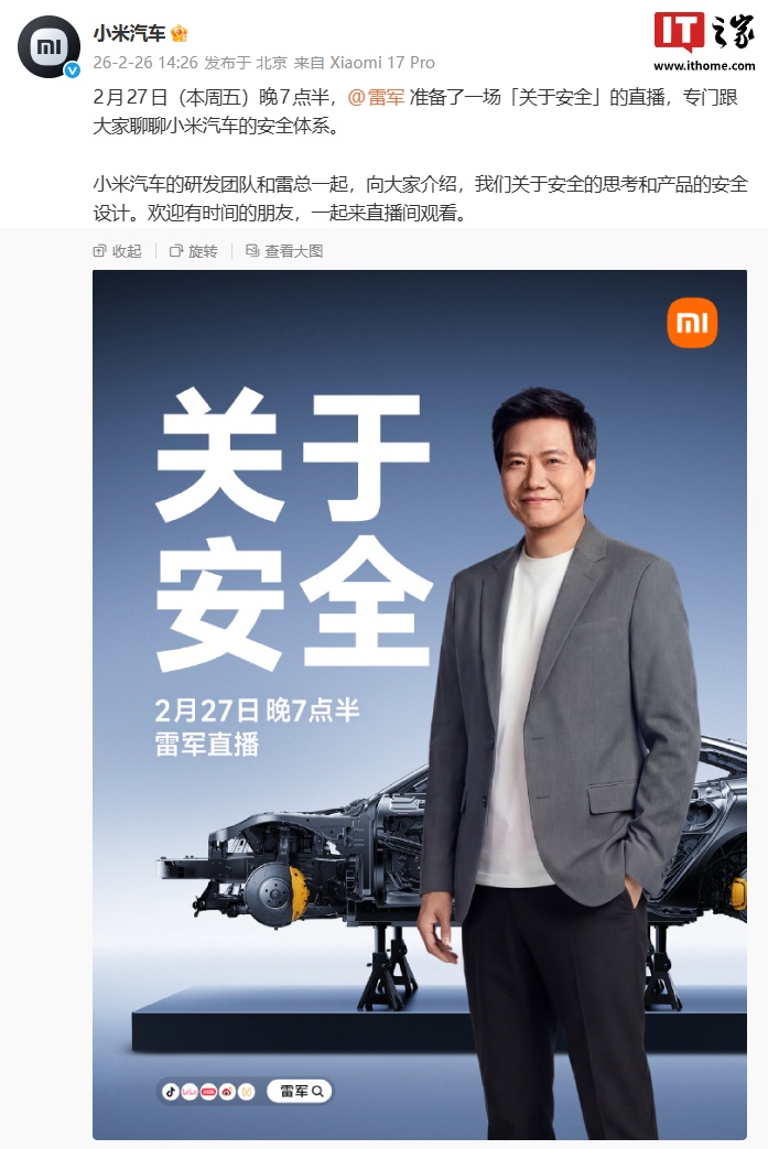 IT之家 2 月 26 日消息,小米汽车官方今日发布预告:2 月 27 日(本周五)晚 7 点半,小米创办人、董事长兼 CEO 雷 军准备了一场「关于安全」的直播,专门跟大家聊聊小米汽车的安全体系。 IT之家注意到,雷军近期已开启数场直播,曾聊过新一代小米 SU7、新一代 SU7 研发故事等,而每次直播的一大"彩 蛋"就是雷军会回应一些热点问题。雷军此前就曾正面回应过 CLTC 工况、小米 SU3 渲染图、玄戒 O1 读作玄戒 01、小 米接触 KOL 事件等热议话题。 值得一提的是,小米集团董事长特别助理、战略市场部副总经理徐洁云就曾表示:"关于集中辟谣,昨晚只是个开 始。" ...