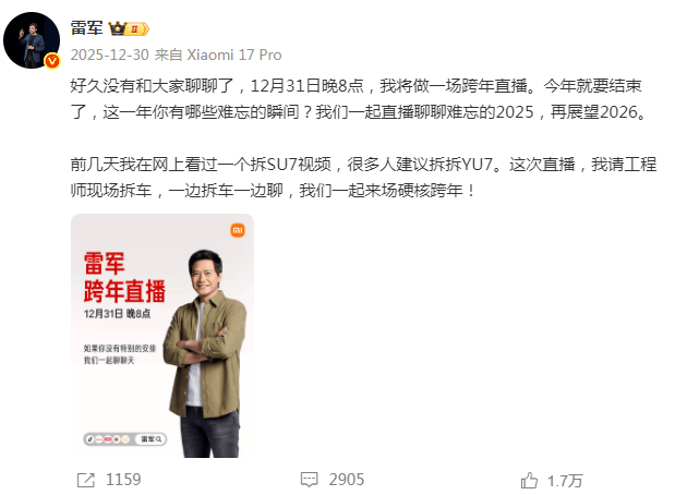 2025年12月30日,小米创办人、董事长兼CEO雷军宣布,好久没有和大家聊聊了,12月31日晚8点,我 将做一场跨年直播。今年就要结束了,这一年你有哪些难忘的瞬间?我们一起直播聊聊难忘的2025,再 展望2026。 前几天我在网上看过一个拆SU7视频,很多人建议拆拆YU7。这次直播,我请工程师现场拆车,一边拆 车一边聊,我们一起来场硬核跨年! 12月31日雷军发文称:"实在抱歉,我感冒有点严重,原定跨年的直播只能推迟到1月3日晚7点。" 雷军还在直播中透露,小米汽车去年交付了41万辆车。 拆车环节结束后,小米集团公关部总经理徐洁云入场亮相,对近期小米热点话题进行回应。其中,徐洁 云主动提及近期"小米不让农民卖小米"一事。 徐洁云表示,此事完全是被误导扭曲之后造成的误解。"小米公司与作为粮食的小米,这完全是客观的 两回事,其实大家想想也知道这不可能,我们绝没有这样的动机,当然更不可能有这样的本事去说不让 农民卖小米了。" 雷军表示,相信大家的眼睛是雪亮的,哪些是调侃,哪些是恶意的抹黑攻击。"特别说明一下,我就在 农村长大的,我怎么可能不让农民卖小米?出现这样的热搜时,真的让我很愤怒。"雷军说。 1月3日晚上, ...