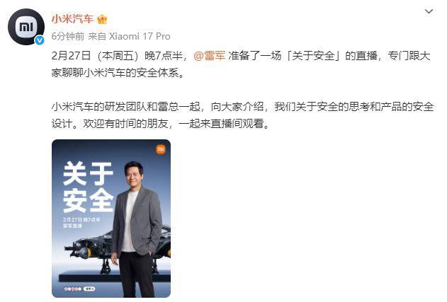 2月26日,@小米汽车发文: 我邀请了几位专家和我一起直播,讲的内容非常专业,可能也会有点儿枯燥。但安 全高于一切,我还是想把小米汽车的整套安全体系完整介绍一下。欢迎朋友们一起 来听听。 随后雷军也发文宣布:我准备在2月27日晚7:30开一场直播,就在小米汽车工厂里,专题跟大家聊聊小 米汽车的安全体系。我邀请了几位专家和我一起直播,讲的内容非常专业,可能也会有点儿枯燥。但安 全高于一切,我还是想把小米汽车的整套安全体系完整介绍一下。欢迎朋友们一起来听听。 量走 Wal 3分钟前 来自 Xiaomi Pad 7 Ultra 我准备在2月27日晚7:30开一场直播,就在小米汽车工厂里,专题跟大家聊聊小米 汽车的安全体系。 2月27日(本周五)晚7点半,@雷军 准备了一场「关于安全」的直播,专门跟大家聊聊小米汽车的安全体 系。小米汽车的研发团队和雷总一起,向大家介绍,我们关于安全的思考和产品的安全设计。欢迎有时 间的朋友,一起来直播间观看。 > 雷军近期已开启数场直播,曾聊过新一代小米SU7、新一代SU7研发故事等,而每次直播的一大"彩 蛋"就是雷军会回应一些热点问题。雷军此前就曾正面回应过CLTC工况、小米SU3 ...
