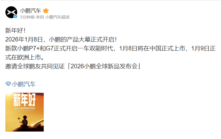 据官方信息,这两款新车将开启所谓"一年双能时代",并于1月8日在中国市场率先上市,1月9日在欧洲市 场上市。发布活动定名为"2026小鹏全球新品发布会"。 凤凰网科技讯1月4日,小鹏汽车通过官方社交账号宣布,将于2026年1月8日举行全球新品发布会。届 时,新款小鹏P7+与G7车型将正式亮相。 ...